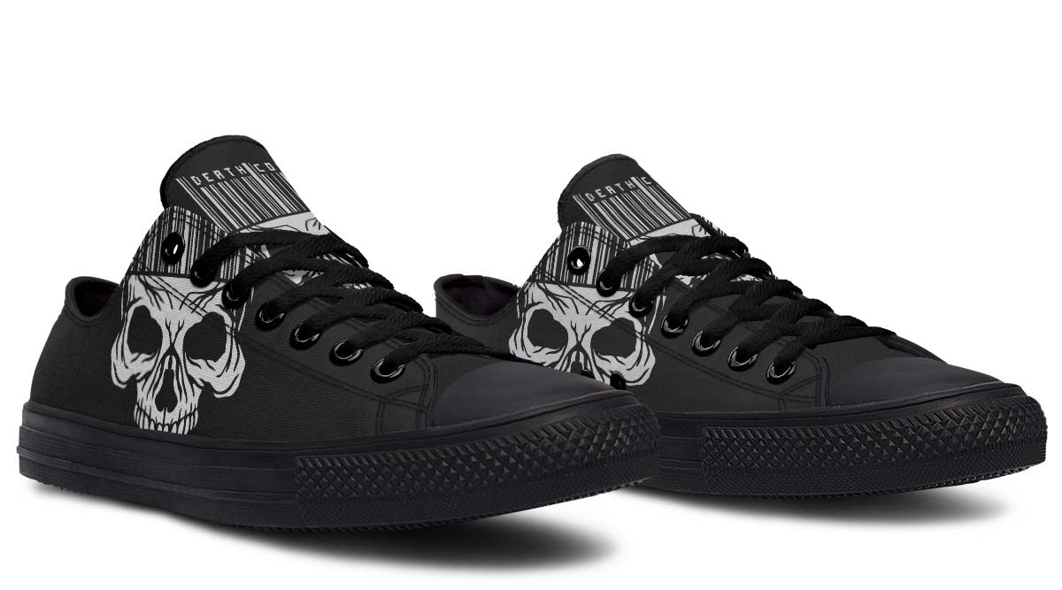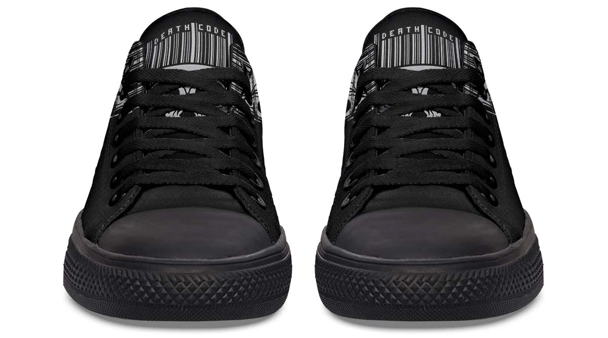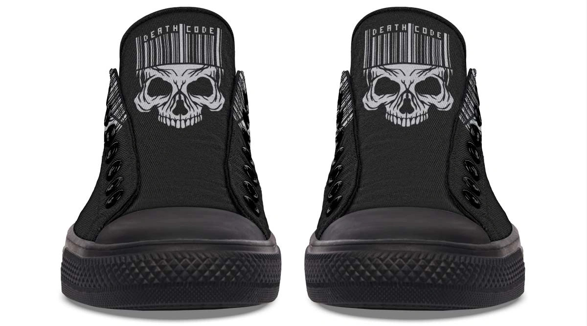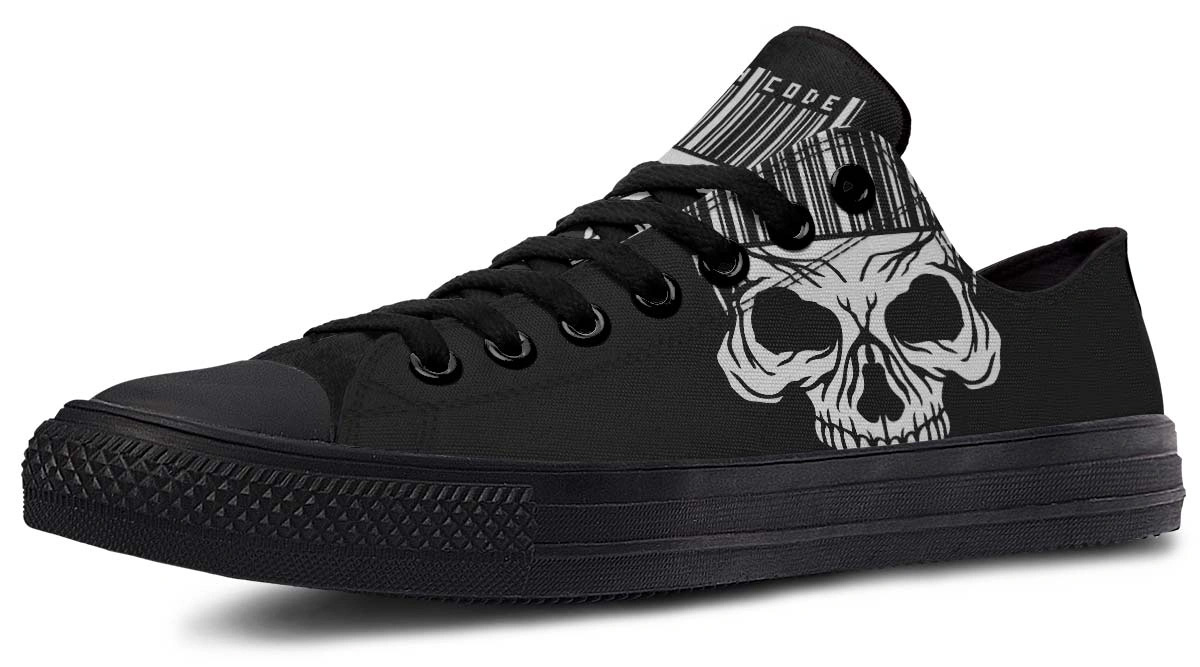 Level up your streetwear with Skull Barcode Black Low-Top Sneakers. Featuring a bold barcode skull design, these edgy sneakers offer comfort and unique style.